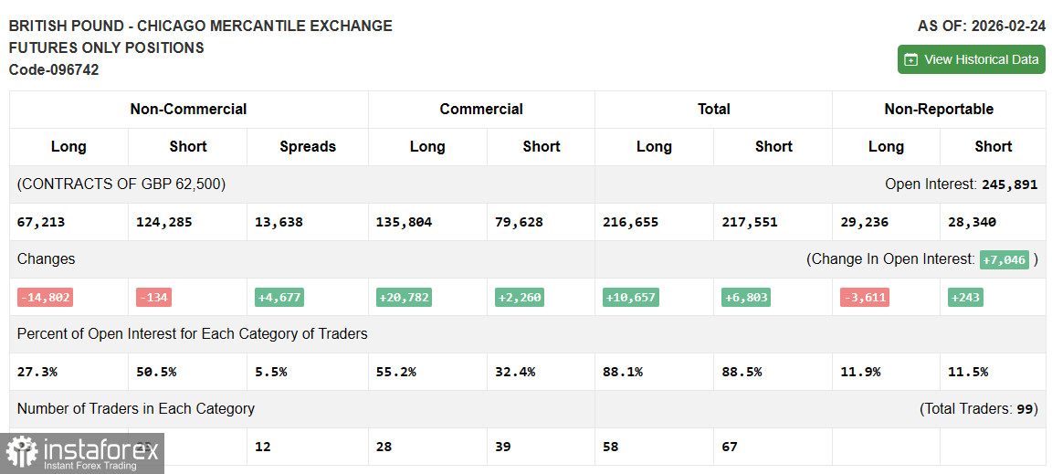 Прежде чем разбирать техническую картину фунта давайте посмотрим, что произошло на фьючерсном рынке. В COT-отчете (Commitment of Traders) за 24 февраля наблюдалось резкое сокращение коротких и длинных позиций. Очевидно, что такой дисбаланс сохранится и дальше – особенно с учетом того, что США развязали войну против Ирана, а власти Великобритании объявили о том, что также могут присоединиться к этому конфликту. В этих условиях целесообразнее сосредоточиться на эволюции ближневосточного конфликта и покупках доллара США в противовес рискованным активам, в том числе и британскому фунту. В последнем COT-отчете указано, что длинные некоммерческие позиции сократились на 14 802 до уровня 67 213, тогда как короткие некоммерческие снизились лишь на 134 до уровня 124 285. В итоге спрэд между длинными и короткими позициями вырос на 4 677.