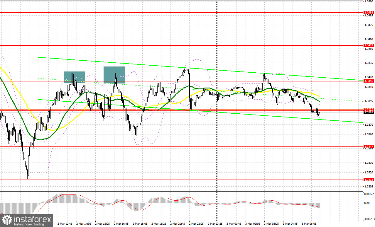 Вчера было образовано несколько точек входа в рынок. Давайте посмотрим на 5-минутный график и разберемся с тем, что произошло. В своем утреннем прогнозе я обращал внимание на уровень 1.3384 и планировал от него принимать решения по входу в рынок. Прорыв и обратный тест 1.3384 привели к точке входа на продажу фунта, что вылилось в падение пары более чем на 60 пунктов. Во второй половине дня активные действия медведей в районе 1.3416 позволили открыть короткие позиции, что вылилось в снижение пары более чем на 50 пунктов.