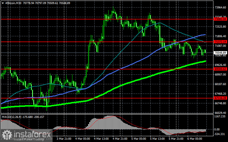 Что касается технической картины Bitcoin, то покупатели сейчас нацелены на возврат уровня $71 300, который открывает прямую дорогу на $73 000, а там уже и рукой подать до уровня 74 600. Самой дальней целью выступит максимум в районе $77 400, преодоление которого будет означать попытки возврата бычьего рынка. В случае падения биткоина покупателей жду на уровне $69 300. Возврат торгового инструмента под эту область может быстро свалить BTC в район $67 100. Самой дальней целью будет область $64 900.