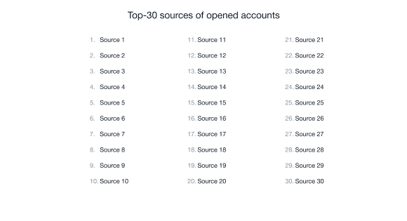 کھولے گئے اکاؤنٹس کے سرفہرست 30 ذرائع