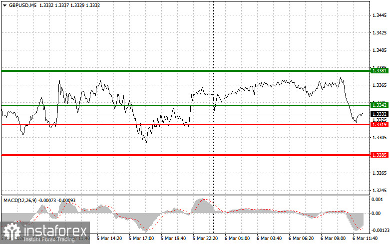 Сценарий №2: продавать фунт сегодня также планирую в случае двух подряд тестов цены 1.3342 в момент, когда индикатор MACD будет находиться в области перекупленности. Это ограничит восходящий потенциал пары и приведет к обратному развороту рынка вниз. Можно ожидать снижения к противоположному уровню 1.3319 и 1.3285.