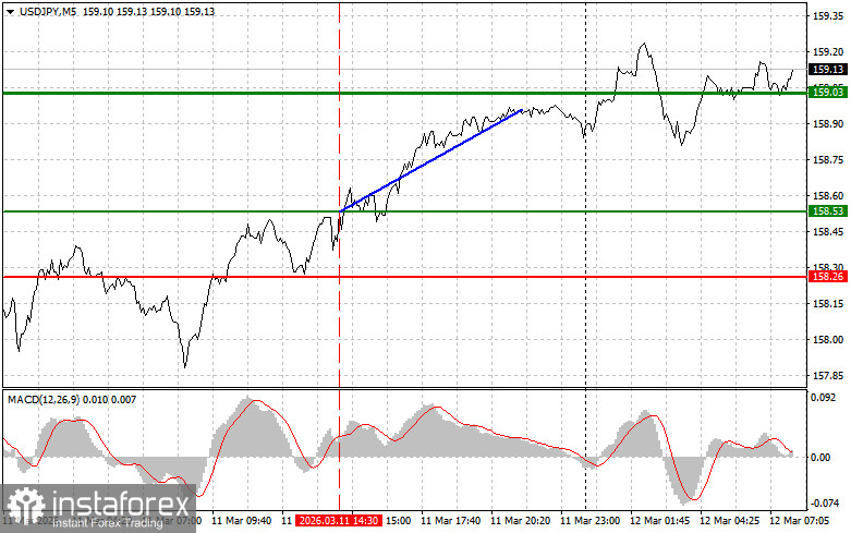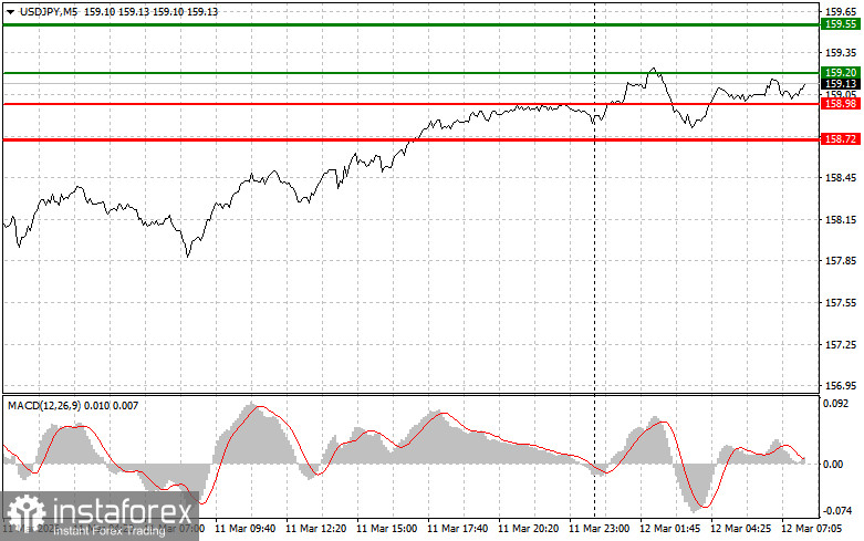 Сценарий №2: продавать USD/JPY сегодня также планирую в случае двух подряд тестов цены 159.20 в момент, когда индикатор MACD будет находиться в области перекупленности. Это ограничит восходящий потенциал пары и приведет к обратному развороту рынка вниз. Можно ожидать снижения к противоположному уровню 158.98 и 158.72.