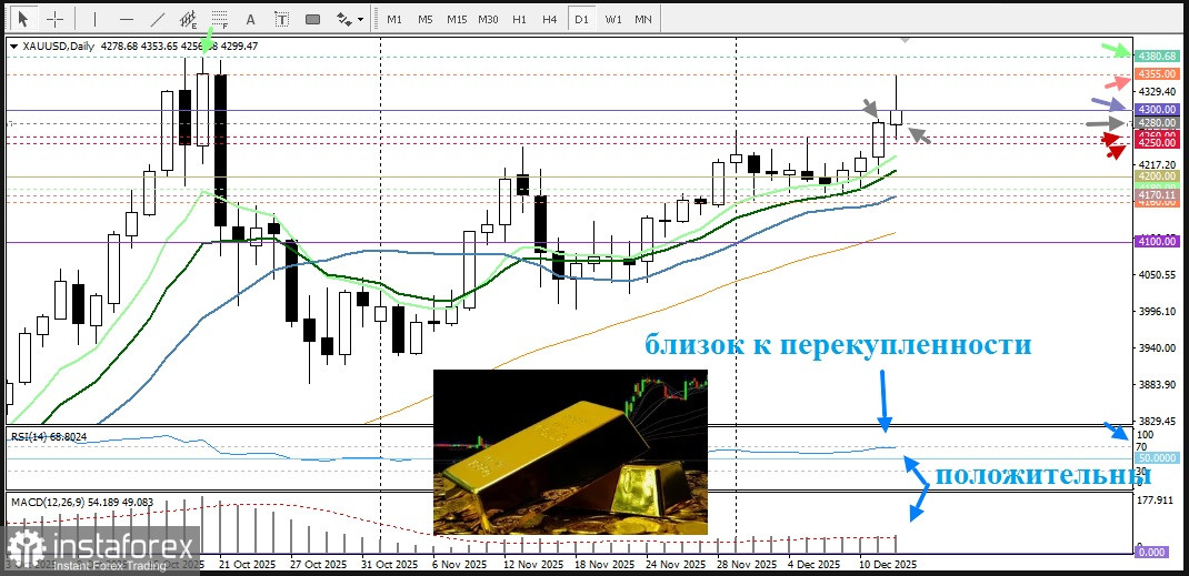 12.12.2025 22:28Вчерашний прорыв границы почти двухнедельного торгового диапазона в районе $4245- $4250 благоприятствует быкам. Плюс к этому, осцилляторы на дневном графике находятся в положительной зоне, но близки к зоне перекупленности, указывая на откат, который может рассматриваться как возможность для покупок. Это ограничит потери пары XAU/USD в районе круглого уровня $4300.