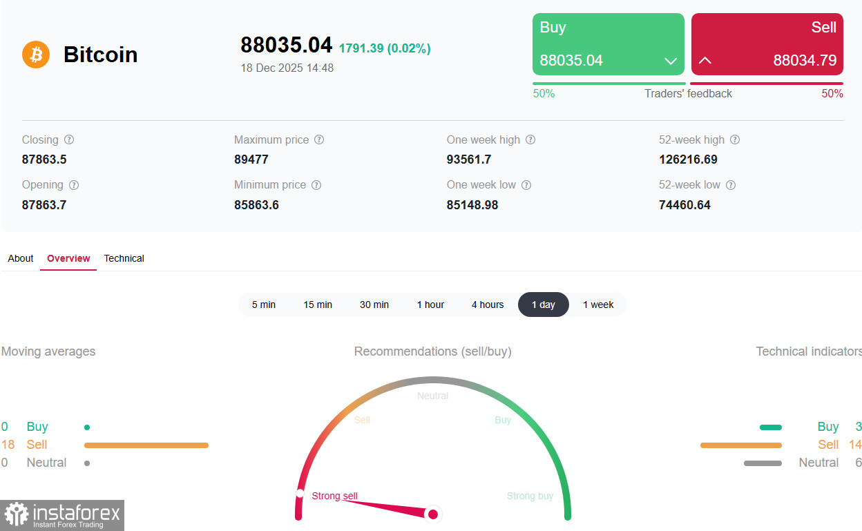 С начала октября и 4-го квартала цена биткоина потеряла около 30% к текущему моменту, опустившись к уровням вблизи 88000.00. Пик цены пришелся на начало октября и на отметки выше 126000.00. Если считать с этого уровня, то снижение составило 43%, а с начала года – примерно 7%.