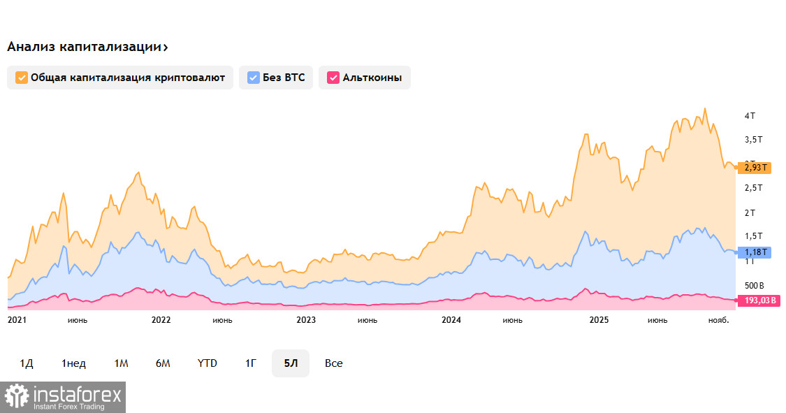 Так, на текущий момент капитализация всего крипторынка составляет примерно 2,93 трлн долларов, что на 41% меньше рекордных 4,15 трлн в конце сентября, по данным TradingView.